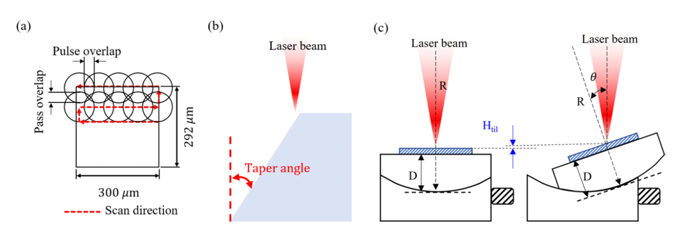 스캔 속도를 조절하여 overlap ratio (ŋ)를 설정하였다. 스캔 경로는 snake scanning을 사용하여 영역 가공을 수행하였으며, 300×300 µm2 영역을 가공 완료하였을 때를 1회 스캔으로 정의하였다 (그림 1(a)). 그림 1(b)는 가공된 시편의 테이퍼 각도를 나타낸 개략도로 가공을 완료한 후 측벽을 절단하여 각도를 측정하였다.