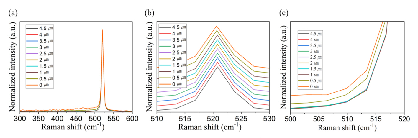 그림 10(a-c)는 가공된 측벽의 단면을 측벽으로부터 떨어진 거리(Dsidewall) 별로 라만 분광 측정한 결과를 나타낸 그래프이다. 모든 측정 포인트에서 단결정 실리콘의 Raman peak인 520 cm-1 근방에서 peak를 가지는 것을 그림 10(a)에서 확인할 수 있었으며, 비정질 실리콘의 Raman peak인 480 cm-1는 측정되지 않았다. 자세한 측정 결과값은 표 1에 나타내었다. 그림 10(b)와 표 1에서 Dsidewall 별 Raman peak 포인트를 확인할 수 있으며 이를 활용해 잔류 응력(σ) 계산식(식 3) [52]에 대입해 각 측정 포인트별 잔류 응력을 계산하였다.