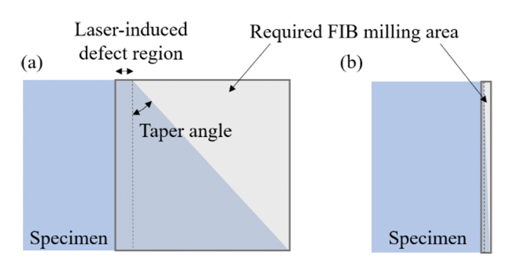 Schematic diagram of required FIB milling area after the laser machining with (a)