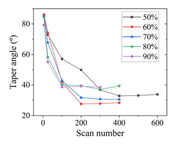 이를 바탕으로 F=1.56 J/cm2로 설정한 조건하에서 η 및 스캔 횟수에 따른 300 × 300 μm2 영역에 가공된 테이퍼 각도를 그림 5에 나타내었다. 모든 가공 조건에서 스캔 횟수가 증가할수록 테이퍼 각도는 감소하나 일정 이상으로 감소하지 않고 수렴함을 확인하였다. η = 60%로 가공한 테이퍼 각도가 27.9°로 가장 가파른 것을 확인하였고, F = 1.56 J/cm2, η = 60%, 그리고 스캔 횟수 300회를 최적 조건으로 선정하였다.