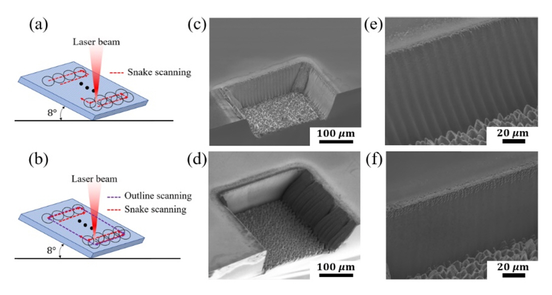 ratio, scan speed 등의 레이저 가공 변수를 제어한 연구들이 존재한다[28, 51]. 본 연구에서는 스캔 경로를 제어해 펄스 중첩을 최소화하고 측벽 형상을 제어하였다. 기존의 스캔 경로인 snake scanning (그림 8(a)) 이후 outline scanning을 수행한 hybrid scanning (그림 8(b))을 적용하여 가공을 진행하였으며, 그 결과는 그림 8(d)와 같다. 테이퍼 각도의 변화는 확인되지 않았으며, snake scanning을 적용하여 가공한 측벽 (그림 8(e))과는 달리 curtaining effect가 발생하지 않음을 관찰하였다 (그림 8(f)). 광학 현미경을 통해 표면 조도를 측정한 결과, snake scanning을 적용하였을 때 Ra = 148.7 ± 6.1 nm인 것에 반해 복합