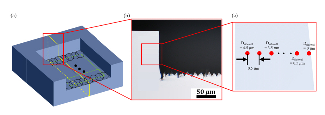 (b) Optical microscope image of laser machined sidewall under the parameters of F = 1.56 J/cm2, η = 60%, scan number = 300, and AOI = 8o. (c) Schematic of the measuring points for