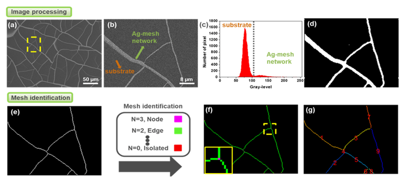 MATLAB 소프트웨어를 이용한 SEM 이미지 분석을 통해 계산한 Ag-mesh network의 밀도와 너비는 수작업을 통하여 계산하여 얻어진 밀도