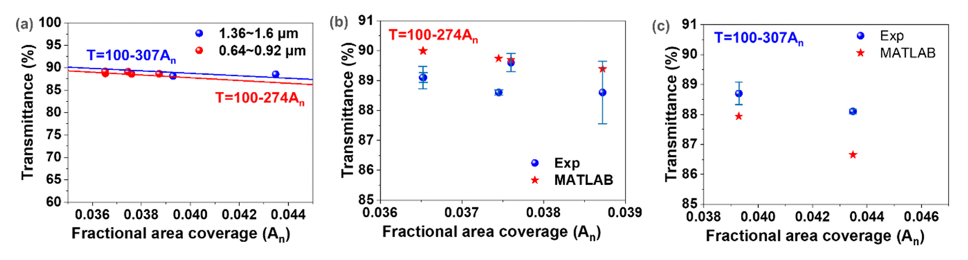 또한, 그림 6(c)는 피팅 파라미터가 307인 샘플들의 An에 따른 투과도를 보여준다. 앞의 경우와 비슷하게 An이 0.03929에서 0.04348로 증가할 때 투과도의 측정 값은 88.7%에서 88.1%로 감소하였으며, 이미지 분석을 통한 계산 값도 87.94%에서