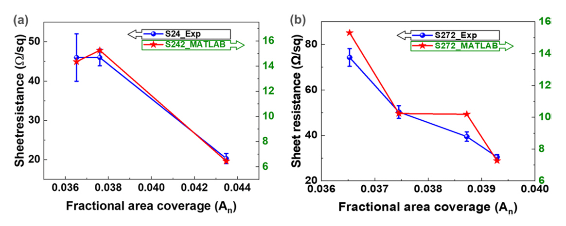 특성과 식(4)를 통하여 구하였다. 그 후, 실제로 측정한 면저항 값과의 비교 결과를 그림 7에 나타냈다. 그림 7(a)에는 S242 샘플에 대한 면저항의 실험값과 이미지 분석 결과값을 비교하여 나타냈다. 실험을 통해 측정한 면저항(S242_Exp)은 An이 0.03652에서 0.0376, 0.04348으로 증가함에 따라 46, 46, 20.3 Ω/sq로 감소하였다. 반면에 이미지 분석을 통해 예측한