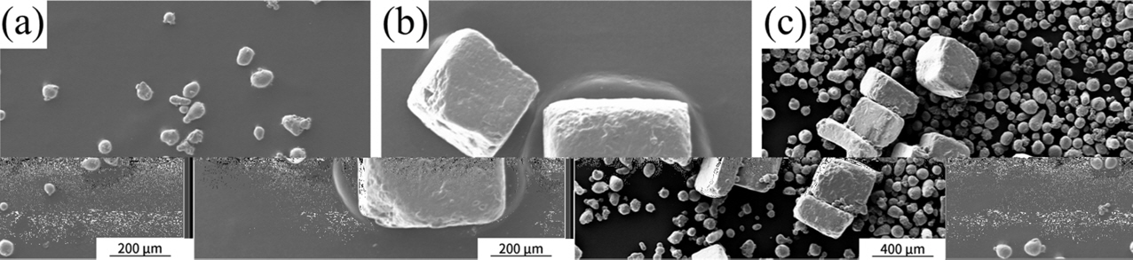 SEM images of powders. (a) Aluminum powder, (b) NaCl powder, (c) mixed powder.