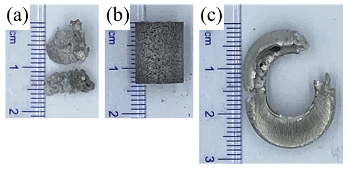 ๊ทธ๋ฆผ 1์ SPS์ CM ๋ฐฉ๋ฒ์ ํตํ Al ๋ค๊ณต์ฒด ์ ์กฐ ๋ชจ์๋์ด๋ค. Al ๋ถ๋ง๊ณผ NaCl ๋ถ๋ง์ ํผํฉํ๋ ๊ณผ์ ์ ๋์ผํ๋ฉฐ, ์๊ฒฐ ๊ณผ์ ์์ ์ฐจ์ด๊ฐ ์๋ค. ๊ทธ๋ฆผ 1(a)๋ SPS ๋ฐฉ๋ฒ์ผ๋ก ๊ธฐ๊ณ์ ์๋ ฅ ํ์์ ๋ถ๋ง ์