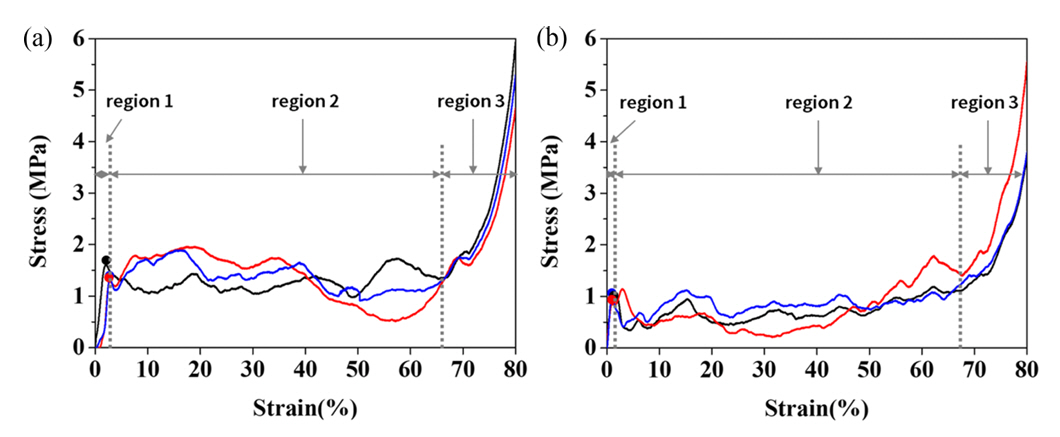Compressive stress-strain curves for Al foam. (a) Spark plasma sintering sample at