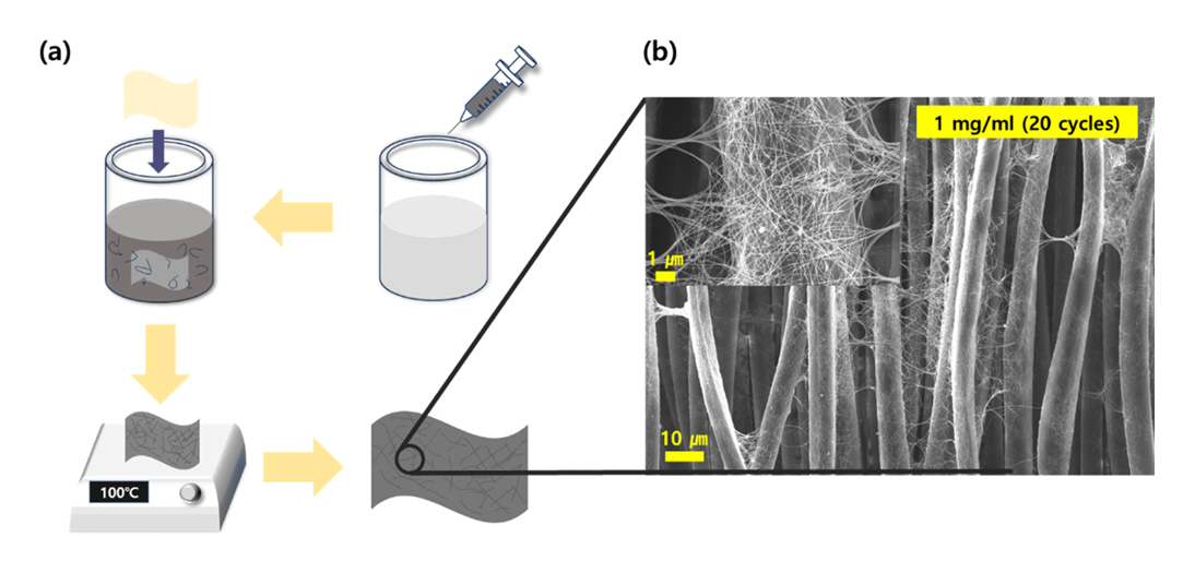 그림 1(a)는 폴리에스테르에 은 나노와이어 네트워크를 형성하기 위해 비커 내 은 나노와이어가 포함된 이소프로필 용액에 섬유의 담금 및 건조과정을 보여주는 모식도이다.