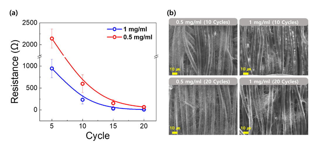 그림 3은 동일한 반복횟수(20회)에서 1 mg/ml (R : 8.8 Ω) 및 0.5 mg/ml (R : 67.0 Ω)의 농도에서 20회의 담금 및 건조를