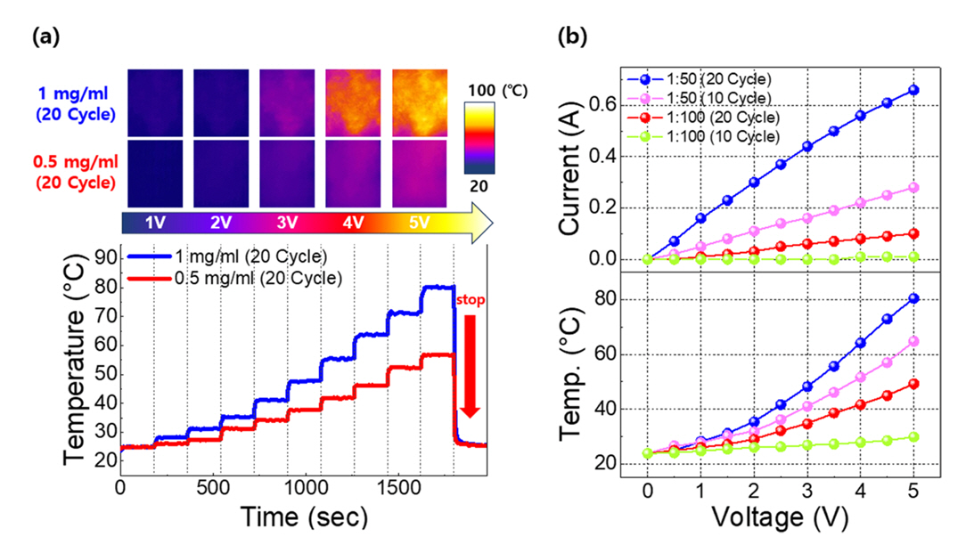더불어 균일하고 신속한 발열 방법에 대한 연구를 진행하였다. 은 나노와이어의 농도가 0.5 mg/ml와 1 mg/ml 로 유지된 이소프로필 용액 내