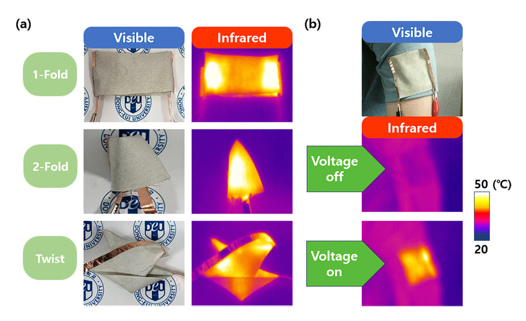 그림 5는 Ag 나노와이어 네트워크가 형성된 직물의 실제 발열 과정을 보여준다. 그림 5(a)는 실제 직물을 착용한 상태에서 발생할 수 있는 여러 형상적인 변형이 가해진 상황에서 발열할 때의 열화상 이미지이다. 은 나노와이어 네트워크의 유연성으로