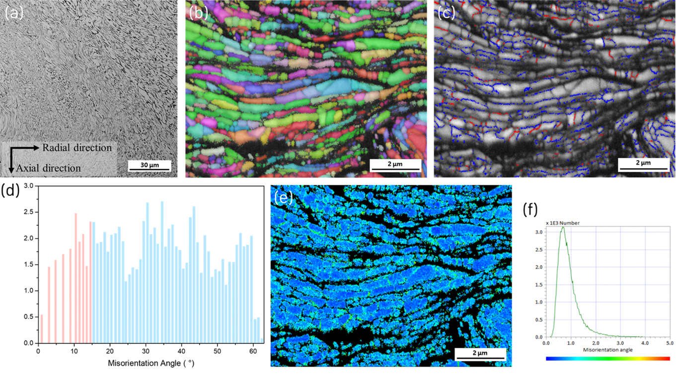 region. Corresponding (c) grain boundary map and (d) KAM map. Distribution of (e)