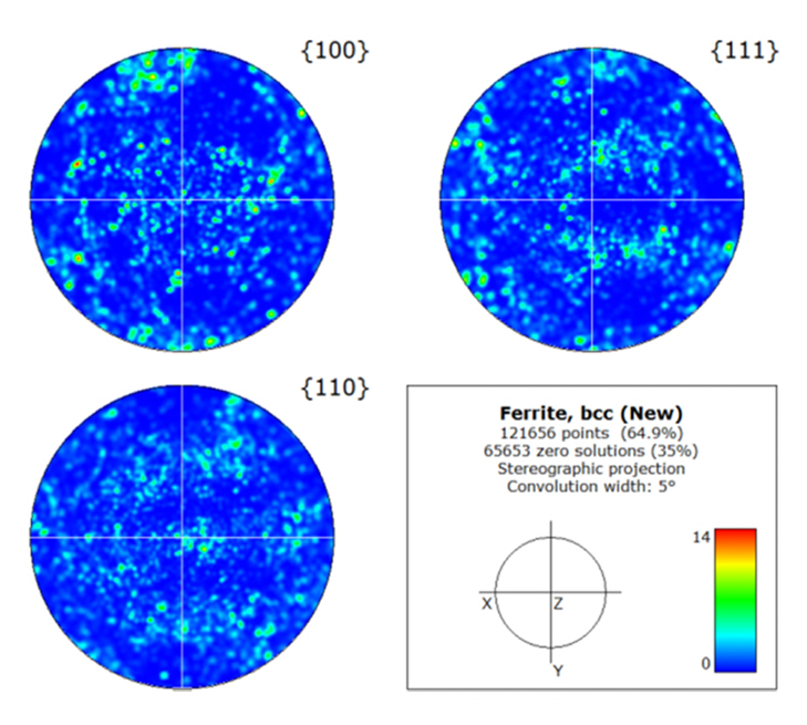 Pole figures representing 3D interconnected Fe80Cr20-Mg ultrafine-grained heterostructured composite after 60 turns of HPT process.