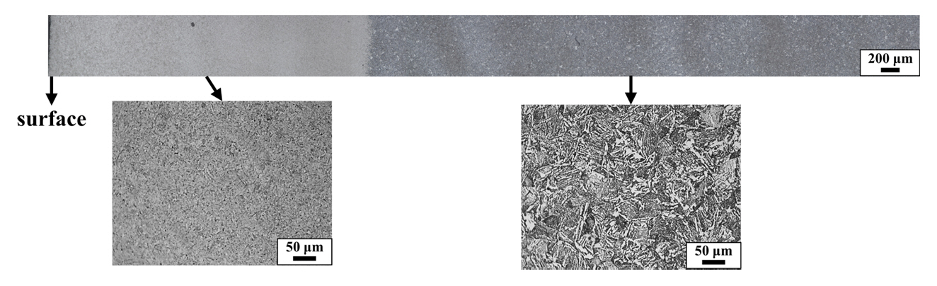 표면으로부터 중심 방향으로 이동함에 따른 미세구조 변화를 확인할 수 있게 시험편을 절단하였으며 그 단면은 마운팅 및 기계적 연마 후 2% 나이탈 용액을