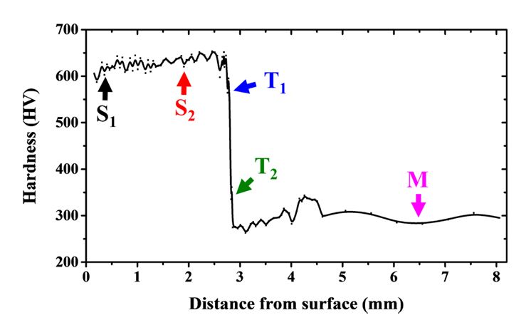 HV 수준의 경도를 보이며 약 2.7 mm 영역까지 경도가 점진적으로 증가하여 최대 650 HV를 나타내는데 이는 그림 1의 표면부 경화층에 해당하는 영역이다. 표면부 경화층 안쪽에는 경도가 급감하는 구역이 존재하며 해당 영역의 폭은 0.1 mm를 조금 넘는 수준이다.