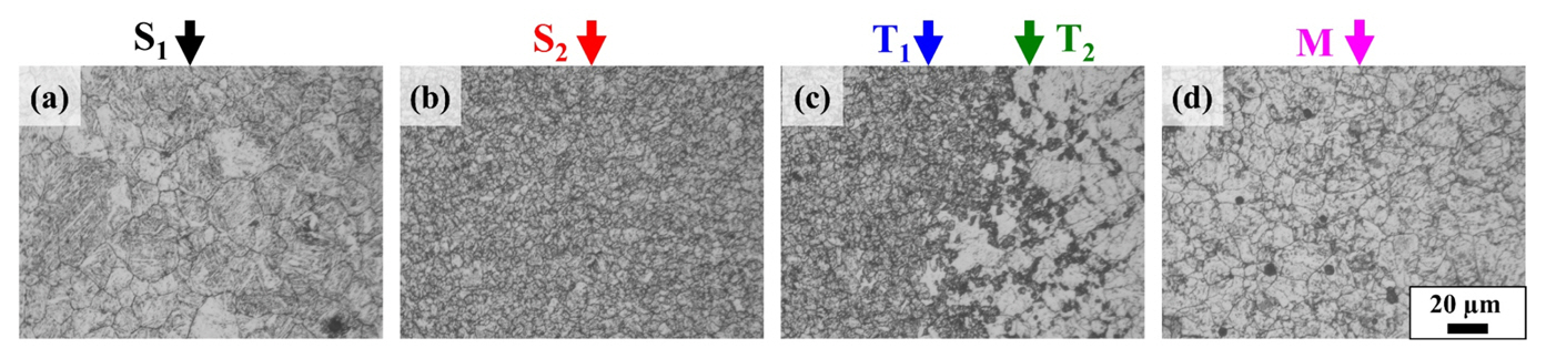 S1과 S2 영역은 모두 100% fresh martensite 조직을 가지지만 packet, block 등의 하부구조는 S1에서 더 크며 이는 열처리 중 최대 도달 온도가 더 높은 S1의 PAGS가 S2 보다 더 조대하기 때문이다. T1과 T2 영역은 tempered LTT 미세조직과 fresh martensite가 공존하는데 중심부와 더 가까운 T2에서 tempered LTT 미세조직 분율이 더 높다.