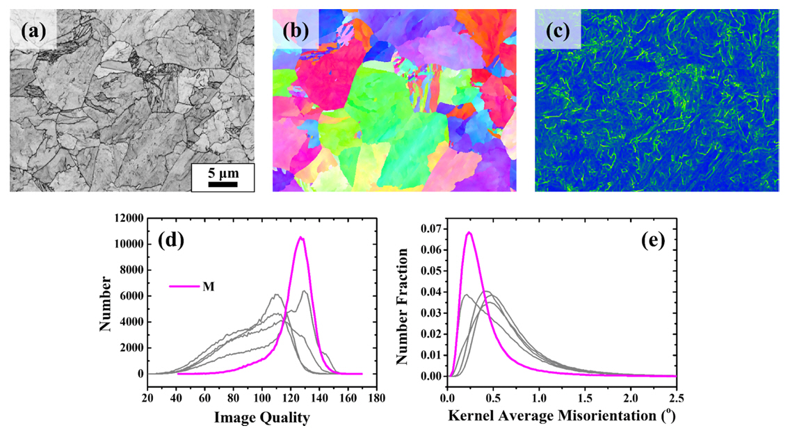 angle, misorientation angle(MA), inverse pole figure(IPF) 등을 활용하여 이미지 혹은 그래프로 제시하였으며