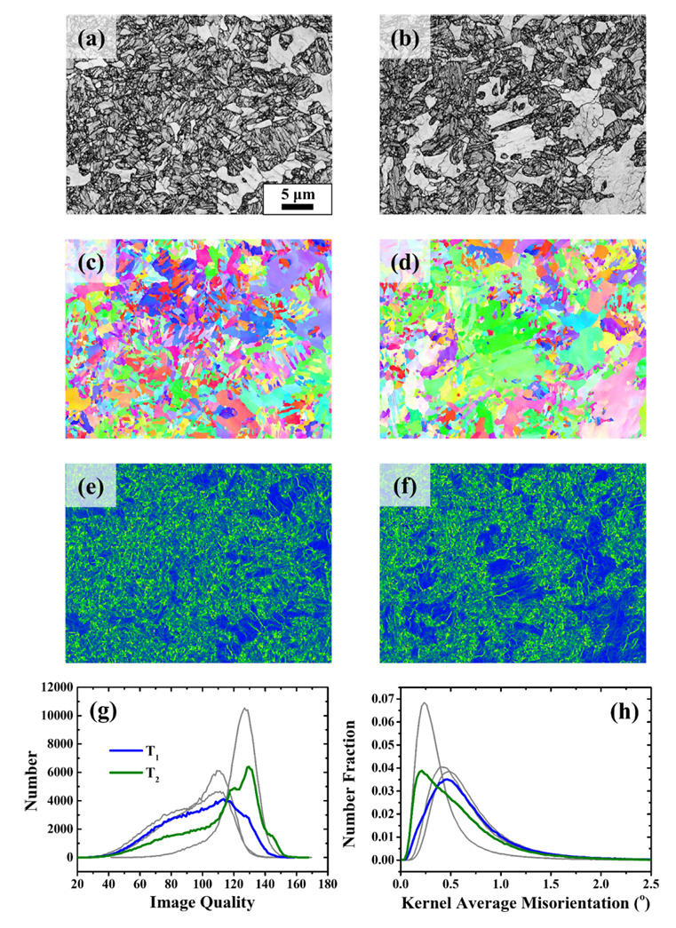 그림 6(g)와 6(h)는 T1과 T2 영역에 대응하는 IQ 및 KAM 분포를 보여준다. Fresh martensite와 tempered LTT 미세구조가 공존하는 경계부의 특성 상 IQ