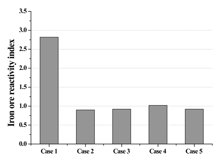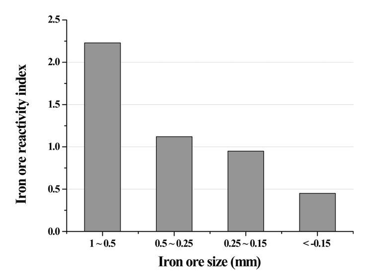 When the iron ore particle size was 1–0.5 mm, the IRI was 2.23, indicating that ~45%