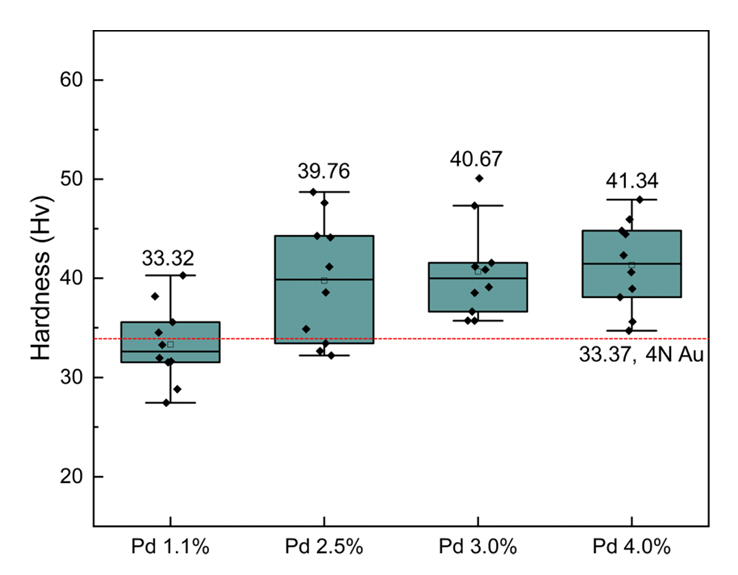 좋지 않다. 따라서 전기적인 성능을 만족시키는 최대 팔라듐 함량은 2.5 wt% 수준으로 판단된다. 팔라듐 함량이 늘어날수록 와이어 표면 경도가 증가하는