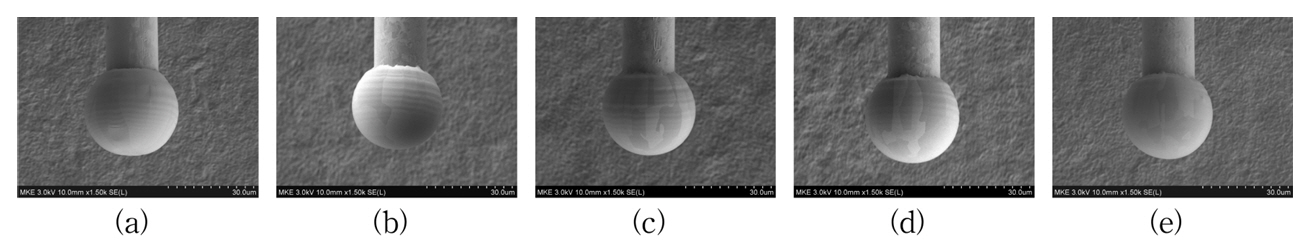 및 95.3%로 측정되었다. 결국 모든 조건의 FAB 진원도는 95% 이상이고 Jae-Hyung Cho 등 의 보고[13]에 의하면 FAB 진원도는 90% 이상이면 접합에 무리가 없는 것으로 보고되어 은합금의 경우 FAB 형상면에서는 기존 금와이어와 동등하였다.