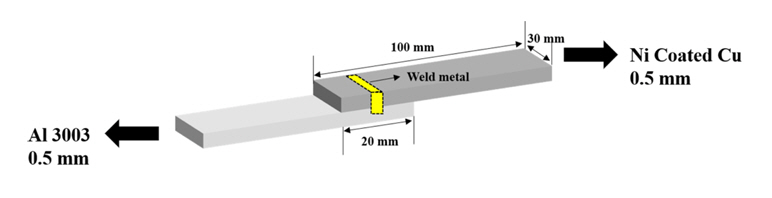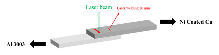 니켈 코팅된 구리-알루미늄의 레이저 용접 개략도는 그림 2와 같으며 용접길이는 20 mm로 설정하였고 Table 2와 같이 레이저 출력과 용접 속도를 가변하여 실험을 진행하였다.