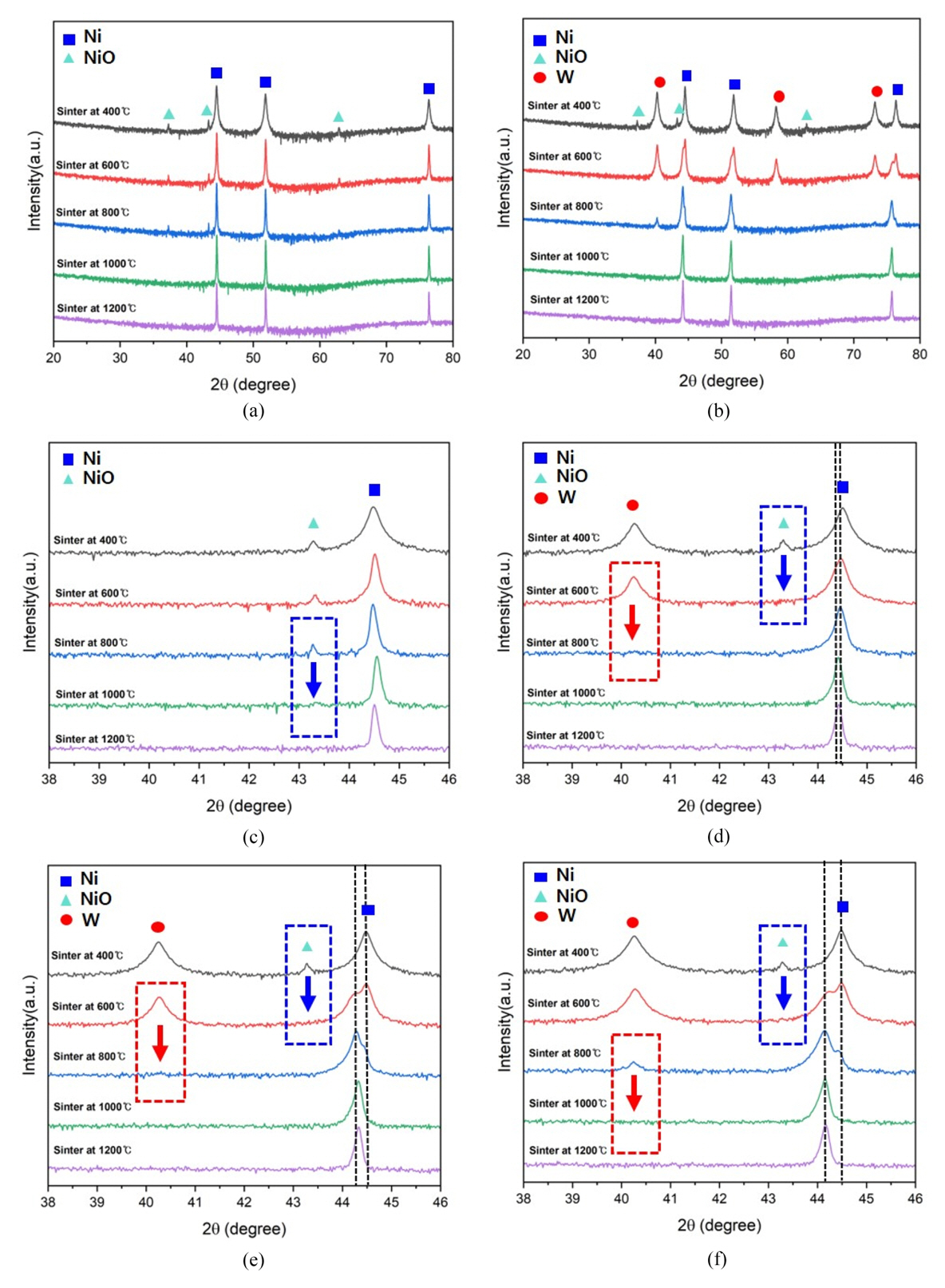 소결 과정에서의 W 함량에 따른 Ni에 최종적으로 고용되는 온도와 상 정보를 확인하기 위해 XRD 분석을 실시하였다. 그림 10의 (c), (d), (e), (f) XRD 분석 결과를 보면 W 피크는 W 첨가 함량이 3 at.%까지 600~800 °C 사이에서 사라지고, Ni-6W에서는 800~1000 °C