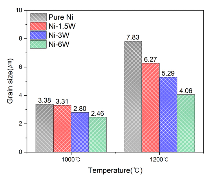 6 at.%일 때, 결정립 크기는 순수 Ni 대비 약 48 % 감소하며, W 함량당 결정립 크기 감소 폭은 줄어드는 것을 알 수 있다.