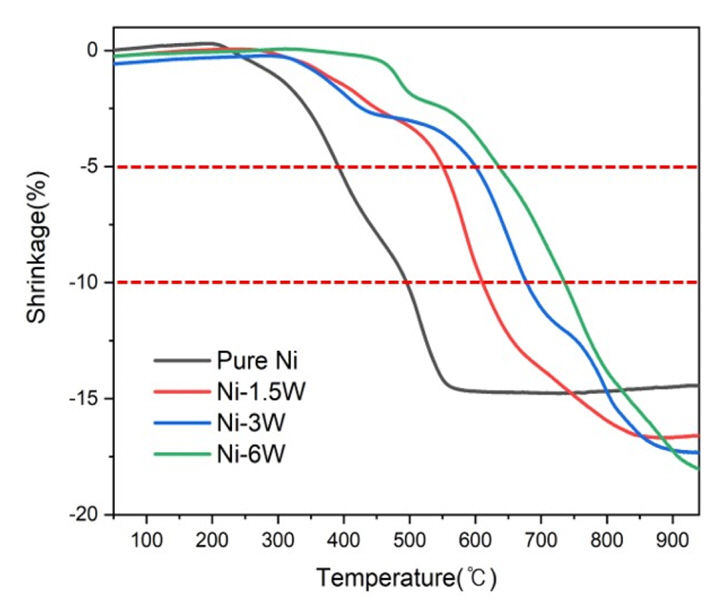 소결 온도가 Ni-1.5W는 순수 Ni 시편 대비 158 °C, Ni-3W는 208 °C, Ni-6W는 243 °C의 증가가 있었으며, 수축률 10