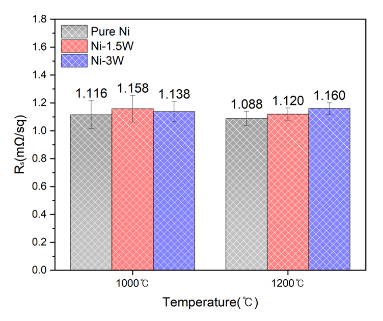 격자의 변형이 발생하여 전자의 이동이 제약되므로 전기 저항이 증가한다. 본 연구에서도 그림 5와 같이 W 함량이 증가함에 따라 순수 Ni 대비 시편의 저항이 유사하거나 약간 상승하는 경향(~7%)을 확인하였다. 그러나 이 증가폭은 Ni의 소결
