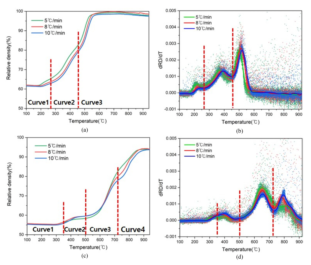 속도별 소결을 진행하여 결과를 정리하였다. 측정한 온도별 수축률을 밀도로 변환한 후(그림 6(a), (c)), 해당 그래프의 온도에 대한 밀도 변화율을 그래프화하면 그림 6(b), (d)와 같다. 이 그래프의 극소점들을 기준으로 순수 Ni은 3개의 곡선으로, Ni-3W는 4개의 곡선으로 구분하였고, 순수 Ni은 주요 소결 구간인 곡선