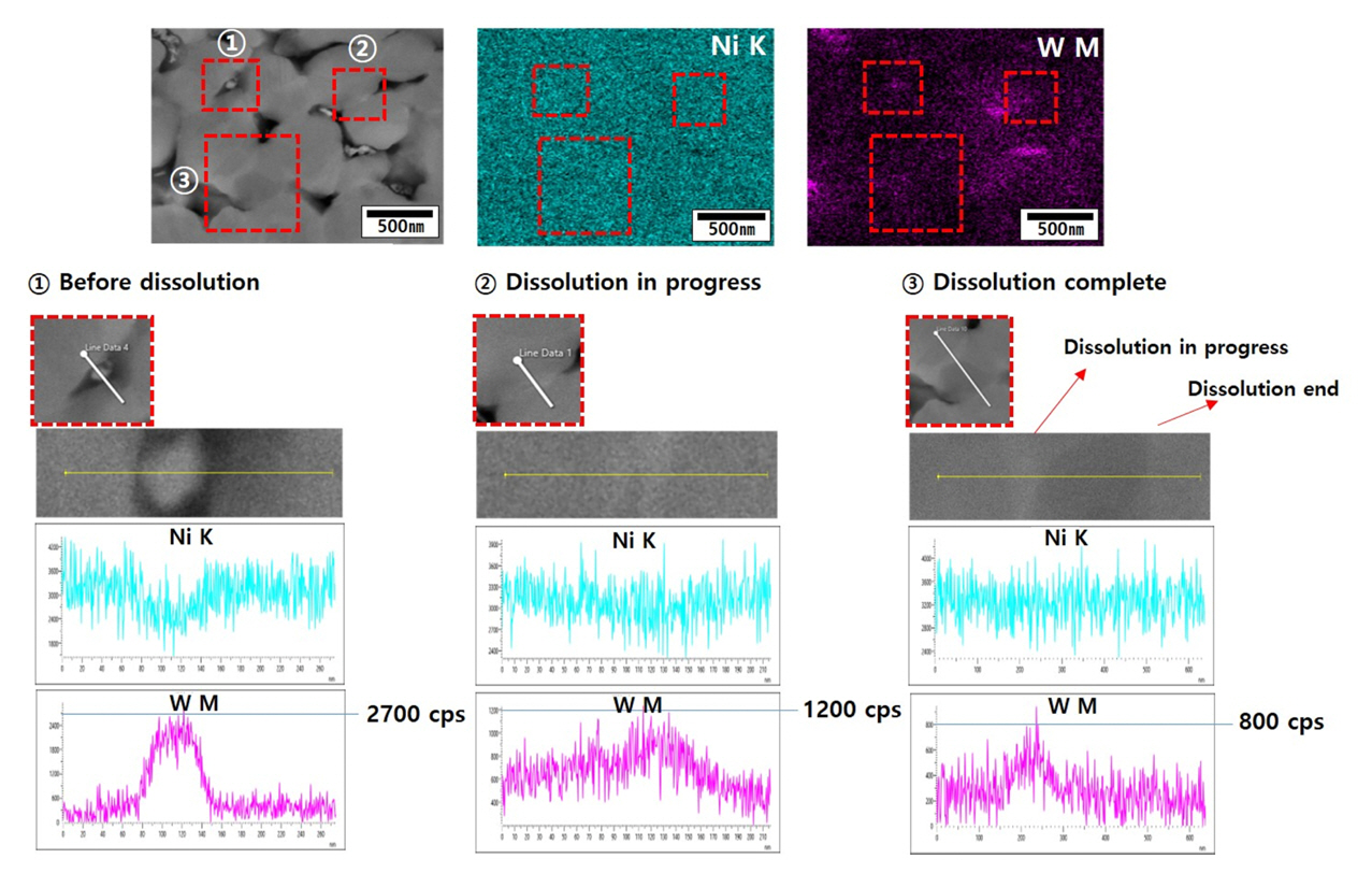 분석했을 때 고용 중인 W은 Ni 입자들이 소결되어 결합된 Ni 입자 사이에 분포하는 것을 확인할 수 있다. 또한 일부 구역에서는 W 고용이 완료되어
