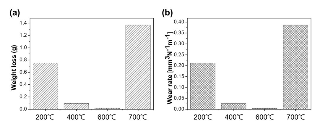 이 때 미끄럼 거리(sliding distance)는 3600 m로 고정하였다. 고온 마모 시험은 200 °C, 400 °C, 600 °C, 700
