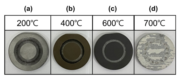 낮은 온도 조건인 200 °C, 400 °C의 경우 마모 볼로 형성된 마모흔이 흑색을 나타내고 있었다. 반면, 높은 온도 조건인 600 °C와 700