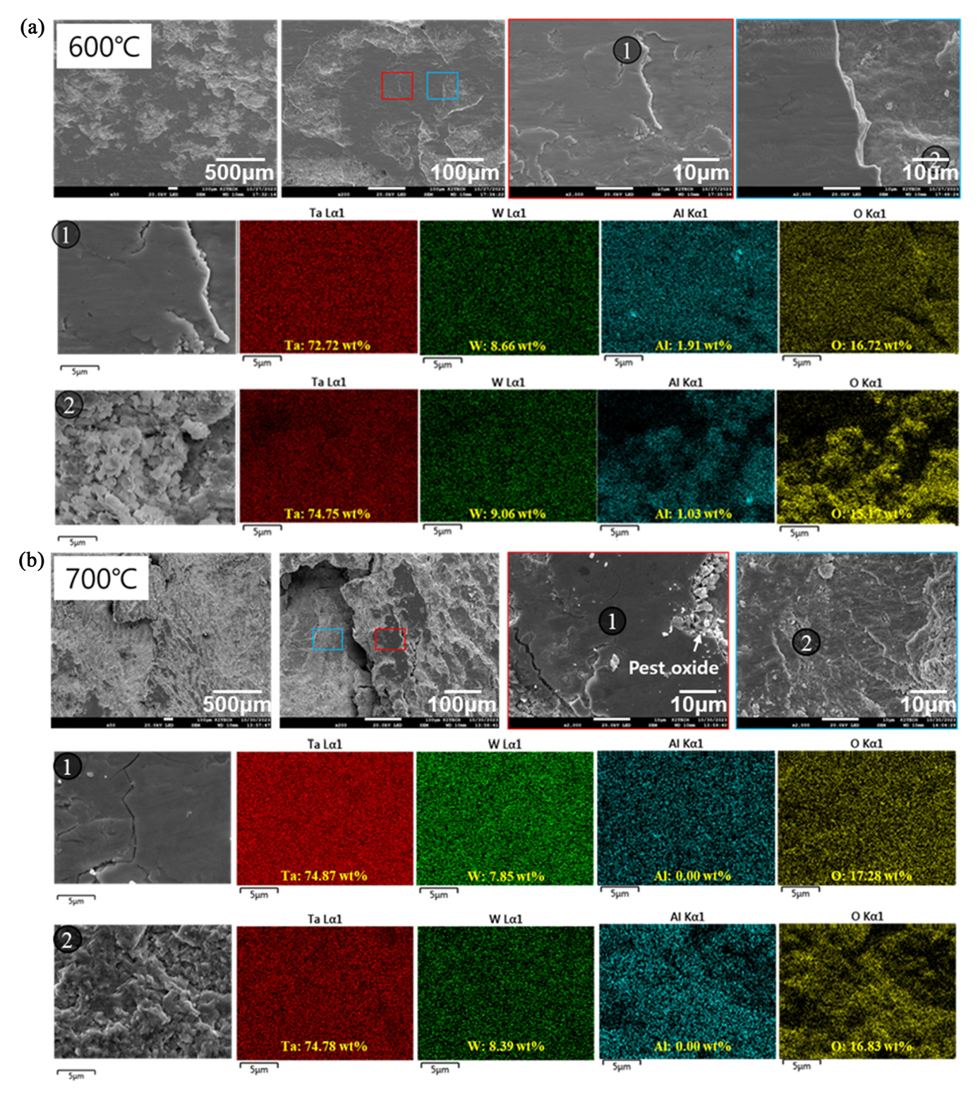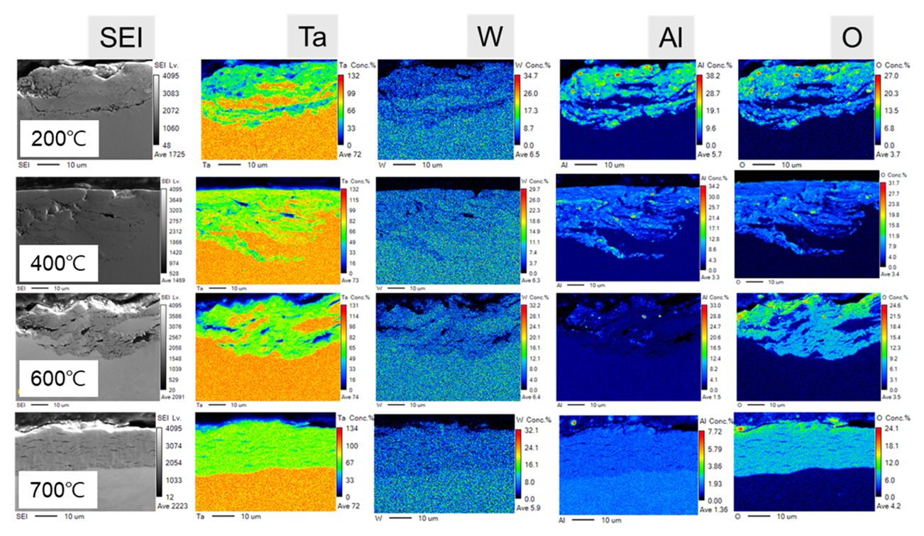 또한 상대적으로 낮은 온도 조건들과 비교하여 pit와 균열이 가장 높은 빈도로 관찰되었다. EDS 맵 결과를 통해 표면에 형성된 산화물은 Ta계 산화물인