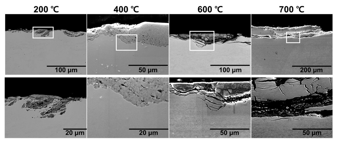 그림 4에 200 °C, 400 °C, 600 °C, 700 °C 고온 마모 시험 후 대표적인 마이크로 표면 관찰 결과들을 정리하여 제시하였다. 먼저, 상대적으로