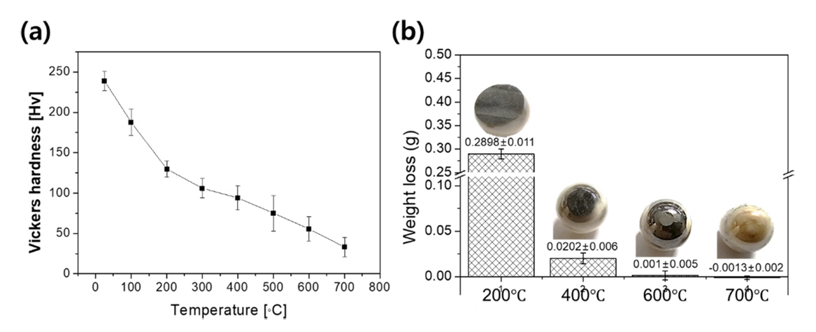 경향을 나타냈으나, 700 °C에서 무게 손실량이 급격하게 증가(마모 저항성의 큰 저하) 특징을 확인할 수 있었다. 미끄럼 마모 시험의 경우 마모