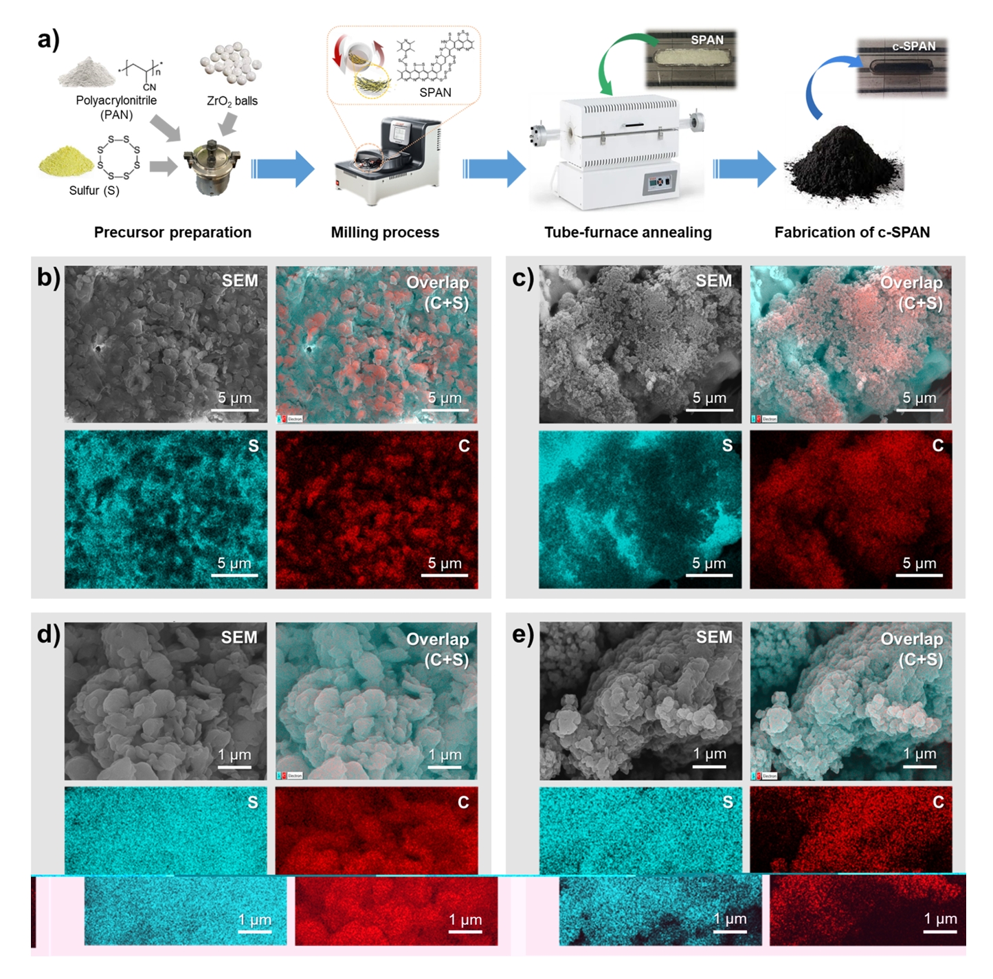 revealed that the sulfur and carbon elements were agglomerated separately (Figure 1(b)). The SPAN synthesized using a mortar/pestle exhibited smaller particle sizes compared