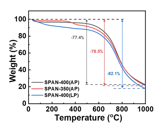 The c-SPAN annealed at 400 °C showed a weight loss of 74.1% in the higher temperature