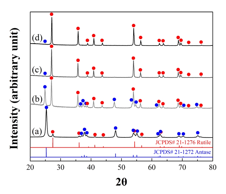 정량적인 분석을 위해 anatase 상의(101) 및 rutile 상의 (110) 피크에 대한 XRD의 강도로부터 상대적인 무게분율을 계산하였으며[16], 700°C에서 1시간 열처리한 분말의 rutile 상 분율은 60.1%, 800°C에서 각각 30분과 1시간 열처리한 경우는 98.6% 및 99.0%로