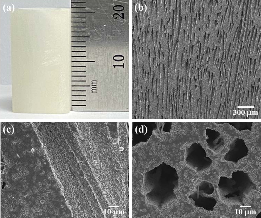 (b) SEM image of longitudinal cross section, (c) magnified image of (b), and (d) pore