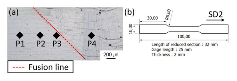๋์ ๋ชจ์ฌ์ ์ฉ์ ๋ถ์ ๊ณ๋ฉด์ ๋ฐ์ํ ์ด๋ก ์ธํ ํ๋ฆผ ๋ฐ ๊ฒฐ์ ๋ฆฝ ์ฑ์ฅ ํจ๊ณผ ๋๋ฌธ์ธ ๊ฒ์ผ๋ก ์ฌ๋ฃ๋๋ค. ๊ทธ๋ฆผ 5 (b~d)๋ ์ด์ํฅ๋ถ์์ ๊ฒฝ๋๊ฐ ๊ฐ์ํ๋ค๊ฐ ์ฉ์ ๋ถ์์ ๋ค์ ์ฆ๊ฐํ๋ ์์์ ๋ณด์ด๋๋ฐ ๊ทธ๋ฆผ 5 (a)์์๋ ๊ฒฝ๋๊ฐ ๋ชจ์ฌ์์ ์ฉ์ ๋ถ๊น์ง ์ ์ง์ ์ผ๋ก ๊ฐ์ํ๋ค. ํ 3์ ๋ํ๋ ๊ฐ ์ํธ์ ์ด์ํฅ๋ถ ๊ฒฝ๋ ๊ฐ์ ์ดํด๋ณด๋ฉด 150 W, 200 W, 250 W, 300 W์ ์กฐ๊ฑด์์ ์ ์๋ ์ํธ๋ค์ ๊ฐ๊ฐ 284.9 Hv,