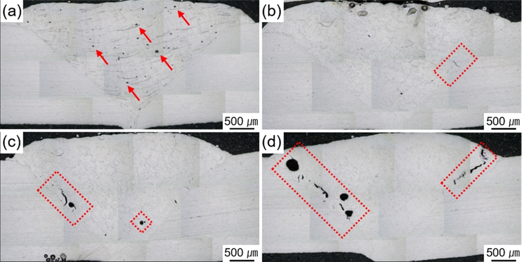 ๊ธฐ๊ณต๋ณด๋ค๋ ์ตํฉ ๋ถ์กฑ์ผ ๊ฒ์ผ๋ก ์ฌ๋ฃ๋๋ค[22]. ๋ชจ์ฌ์ ์ ์ธต๋ถ์ ๊ณ๋ฉด์ ํ์ฑ๋ ๊ท ์ด์ ๊ฒฝ์ฐ ๋ ์ด์ ์ถ๋ ฅ์ด ์ฆ๊ฐํ ์๋ก ๋ ๋ง์ ๊ท ์ด์ด ์๊ธฐ๋ ๊ฒ์ ํ์ธํ ์ ์๋ค. ํนํ ๊ทธ๋ฆผ 3 (d)์์ ๋ํ๋ ๊ฒ๊ณผ ๊ฐ์ด 300 ฮผm ์ด์์ ํฐ ๊ณต๋ (void)๋ค์ด ํ์ฑ๋ ๊ฒ์ ๋ณผ ์๊ฐ ์๋๋ฐ ์ด๋ฌํ ๊ณต๋์ ์ด๋ฏธ ํ์ฑ๋ ๊ท ์ด ์์ ๋ ์ด์ ๊ฐ ์กฐ์ฌ๋๋ฉฐ