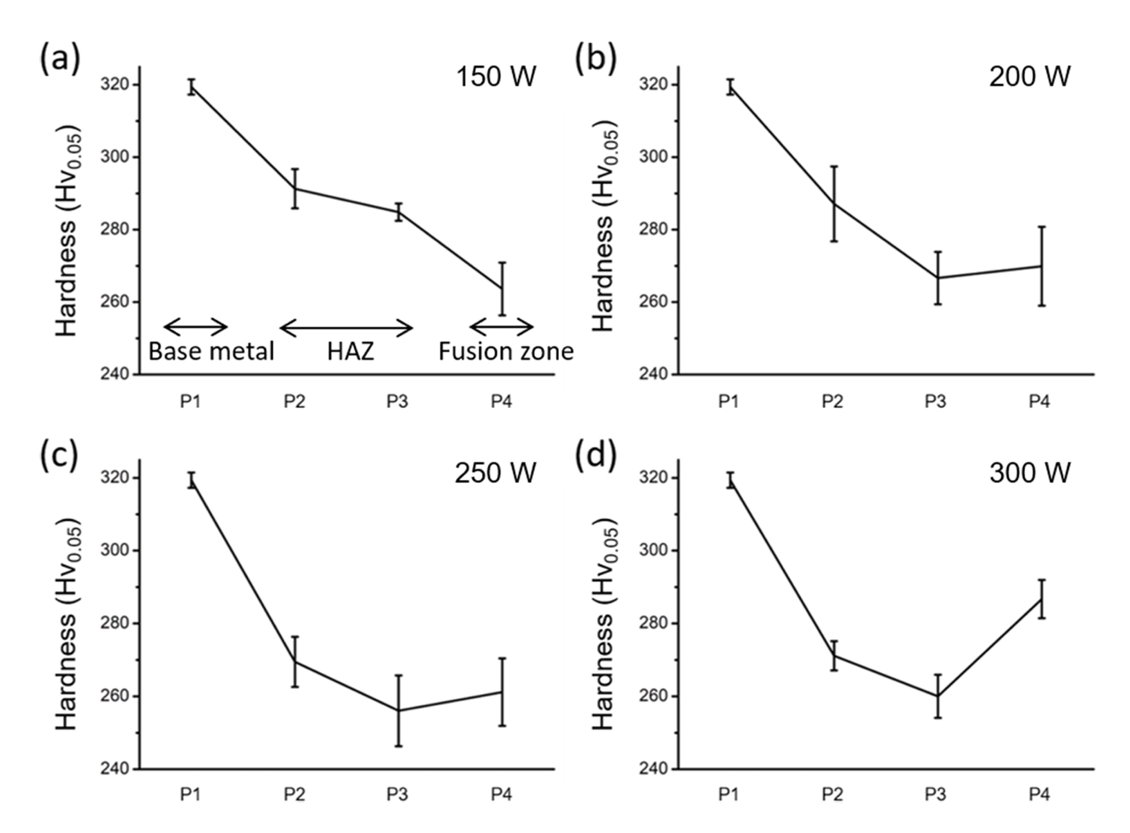 266.6 Hv, 256.0 Hv, 260.0 Hv ๋ก 150W์ ์ถ๋ ฅ์์ ์ ์๋ ์ํธ์ ๊ฒฝ๋๊ฐ์๊ฐ ๊ฐ์ฅ ์ ์ ๊ฒ์ ํ์ธํ ์ ์๋ค. ๋ํ ์ฉ์ ๋ถ์