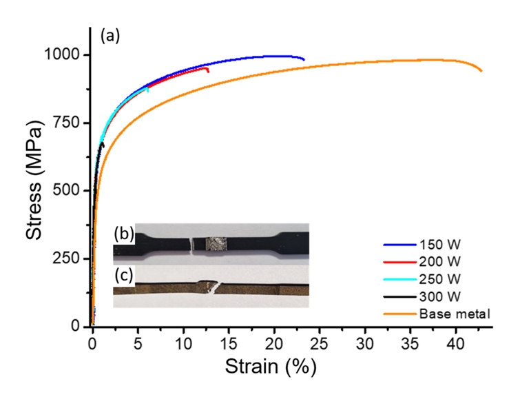 ์ฌ๋ฃ๋๋ค. ๊ทธ๋ฆผ 3์์ ์ํธํ ๊ณ๋ฉด์ ํ์ฑํ 150 W์์ ์ ์๋ ์ํธ์ ๊ฒฝ์ฐ 23.2%์ ์ฐ์ ์จ์ ๋ํ๋ด๋ฉฐ ๋ชจ์ฌ๋ณด๋ค ์ฝ๊ฐ ๋์ 996.8 MPa์ ์ธ์ฅ๊ฐ๋๋ฅผ ๋ํ๋ด์ด