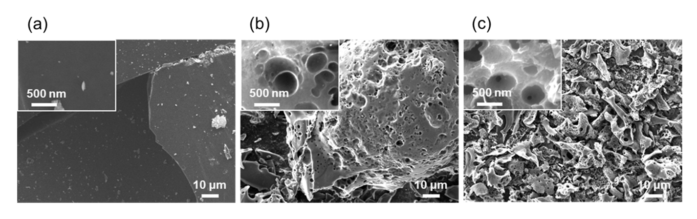 합성된 탄소 표면 형상은 FE-SEM으로 측정하였다 (그림 2). PVDC-resin만 탄화시킨 PC 샘플은 FE-SEM 상에서 기공이 관찰되지 않고 매끈한 표면이 관찰되었다 (그림 2(a)). PC는 큰 기공이 형성되지 않는 반면, PVDC-resin에 CuO를 첨가한 PC-C는 CuO가 템플릿 작용을 하여 큰 크기의 기공이 형성되었다