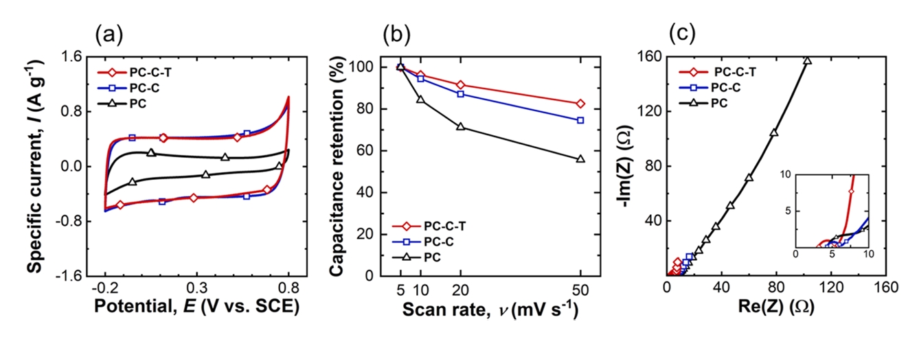 (a) Cyclic voltammograms recorded at a scan rate of 5 mV s-1, (b) rate capability measured at various scan rates (5, 10, 20, and 50 mV s-1), and (c) electrochemical impedance spectra for all three samples (PC, PC-C, PC-C-T)