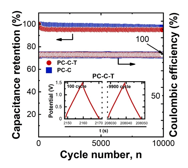 Long-cycling measurement on PC-C and PC-C-T samples in 0.5 M K2SO4 solution operated at 1.5 V with applying 2.5 A g-1 for 10000 cycles (inset: 100 cycle and 9900 cycle of galvanostatic cycling test for