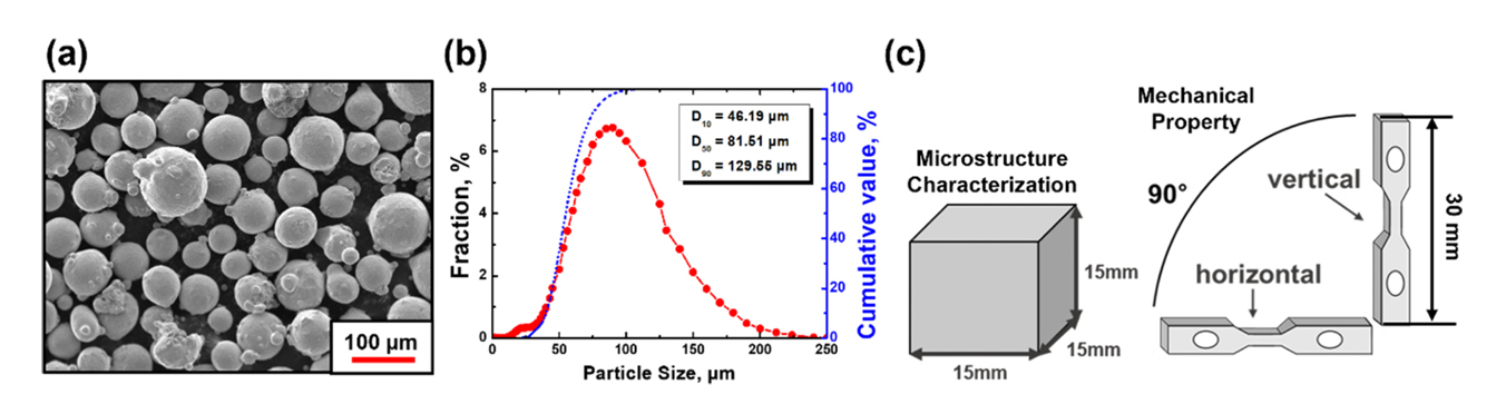 DED ๊ณต์ ์ ํ์ฉํ ์ ์ธต์ ์กฐ ์ํ์ ์ํด ๊ฐ์ค ๋ถ์ฌ๋ฒ์ ํ์ฉํด ๊ตฌํ์ 18Ni300 ๋ง๋ ์ด์ง๊ฐ ํฉ๊ธ๋ถ๋ง์ ํ๋ํ์๋ค. ํ 1์ ๋ณธ ์ฐ๊ตฌ์์ ํ์ฉํ 18Ni300 ๋ง๋ ์ด์ง๊ฐ(MK Metal, Korea)์ ํํ์ ์กฐ์ฑ์ ๋ํ๋ด๊ณ ์์ผ๋ฉฐ, ๊ทธ๋ฆผ 1(a)๋ ํด๋น ์๊ณณ์ ํ์ฉํ ๊ฐ์ค ๋ถ์ฌ๋ฒ์ ํตํด ํ๋ํ 18Ni300 ๋ง๋ ์ด์ง๊ฐ ํฉ๊ธ๋ถ๋ง์ ๋ณด์ฌ์ฃผ๊ณ ์๋ค. ์ฃผ์ฌ์ ์ ํ๋ฏธ๊ฒฝ(Scanning Electron